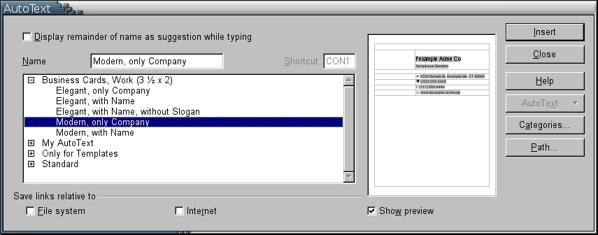 Displaying path names as a filesystem path or as an Internet URL by selecting Edit > AutoText > Save links relative to. Because AutoText is an editing aid rather than a feature of a finished document, this setting exists only for your personal convenience. It has no effect on whether an AutoText entry displays.