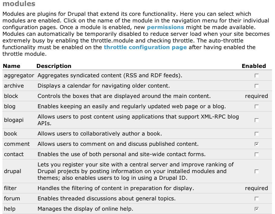 A module is additional code that extends Drupal's functionality. Drupal comes with a set of core modules, and additional modules can be downloaded and installed as needed. The Drupal Web site lists a large collection of contributed modules created by the community. If you need a particular feature, look for a module that offers it. Several modules may offer similar features or even different implementations of a single feature (Figure 1).
