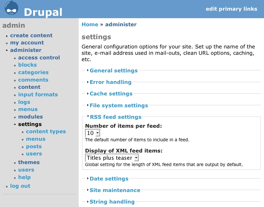 You can download the latest stable release package from the Drupal Web site. Installing Drupal is a fairly straightforward process. It involves creating a MySQL database, importing tables, copying files, setting file permissions and editing a configuration file. Most of the Drupal options can be configured using its Web-based administration interface. Refer to the INSTALL.txt file available with the downloaded package for detailed installation instructions. Additional configuration instructions are available on the Drupal Web site.