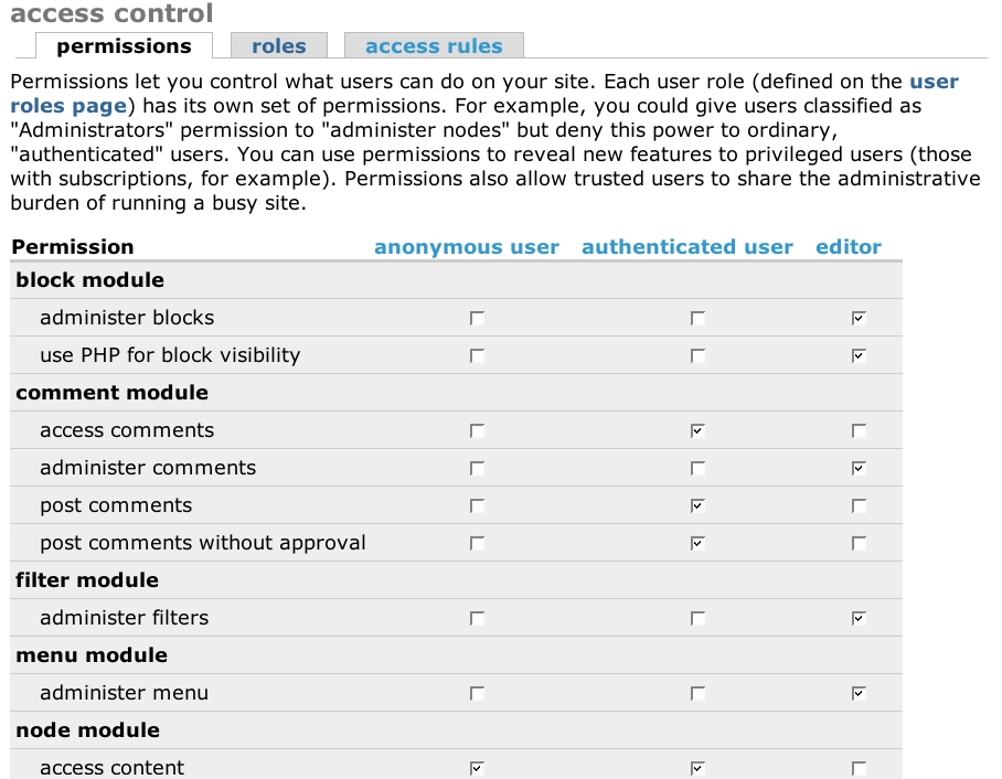 The basic Drupal install leaves you with a usable Web site to which you can start adding content immediately. But, what you see after installation is only the core functionality. Drupal offers much more. In most cases, you will want to tailor Drupal to your particular content management needs. This is where Drupal's flexibility can become overwhelming. After building several Web sites with Drupal, we believe the key to creating successful Drupal implementations—“recipes” if you will—lies in understanding the interplay of five Drupal “ingredients”: module selection, configuration, access control, taxonomy and theme.