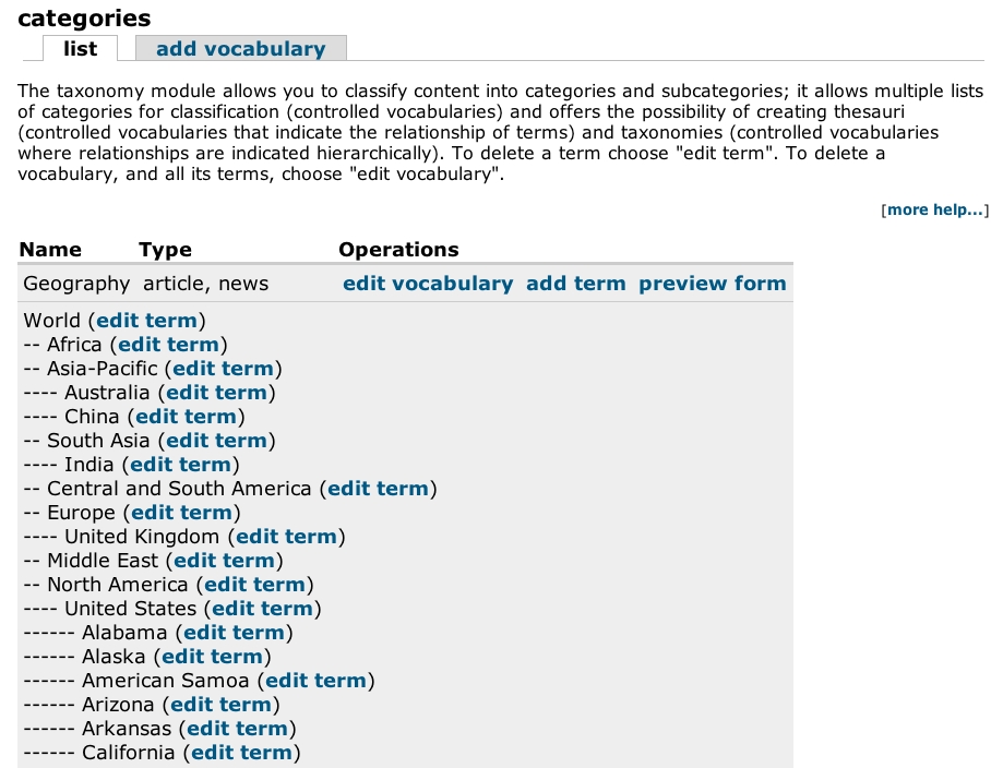 Drupal's taxonomy system enables you to associate a node with one or many descriptive terms. You can create multiple sets of terms called Vocabularies. Vocabularies can be flat or hierarchical lists. For each vocabulary, you can specify which node type it applies to. This combination can help you create a classification system for content that suits your particular information architecture needs. Many other features and modules depend on the taxonomy. For example, you can generate navigation elements, control access to content or switch visual presentation based on taxonomy. Take the time to develop good taxonomy vocabularies and design them so you can expand them easily in the future (Figure 4).