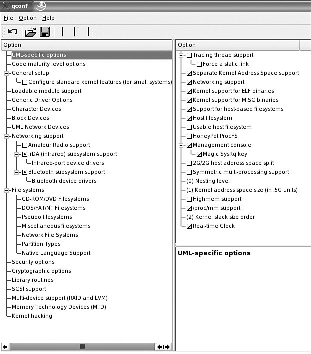 Some Linux distributions have added the UML patch to their kernel for both the 2.4.x and 2.6.x levels of the kernel and provide a UML kernel with the distribution. The first step is to check the kernel config and see if UML is enabled. One way to do so is to use the make xconfig ARCH = um command in the directory of the kernel source tree, usually in the /usr/src/linux directory. The UML kernel is enabled on the "UML-specific options" support menu. Enable the UML options and build the kernel.