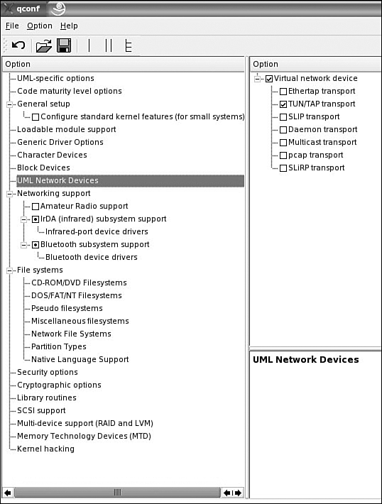 The UML network devices are enabled on the UML Network Devices menu, as shown in Figure 6. The main menu option is Virtual network device. If this option is enabled, seven transport options are available. Versions of UML other than the one shown here might have more or fewer configuration options.