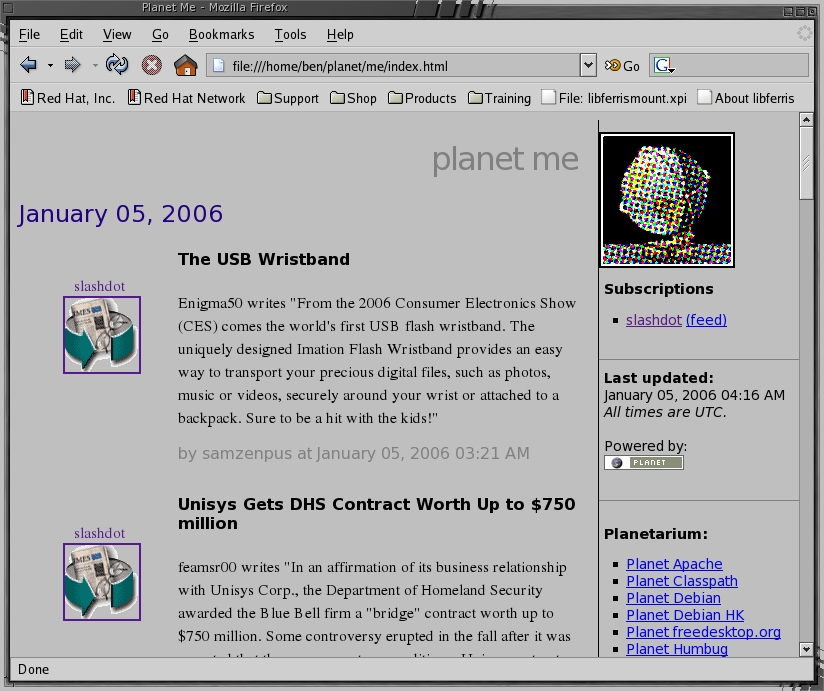 $ edit ~/planet/me-meta/config.ini [http://rss.slashdot.org/Slashdot/slashdot] name = Slashdot face = slashdot.png $ cd ~/planet $ python planet.py me-meta/config.ini