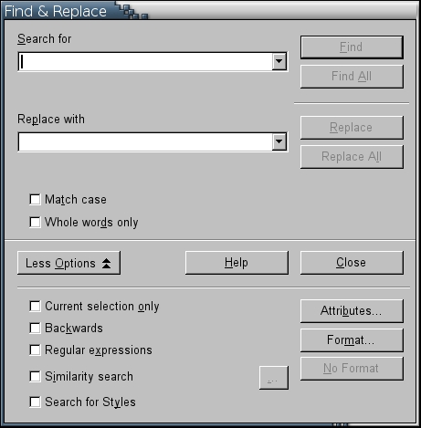 To this basic option, Writer adds the ability to search by Attributes or Formats. The difference between these two options is obscure, but it seems to come down to this: when you search for Attributes, you are looking for any departures from the default formatting, but you cannot specify which variations. By contrast, when you search for Format, you can specify the exact design elements, such as the precise Font or Font Size. On the whole, Attributes are useful for searching a manually formatted document. Formats, on the other hand, are useful for documents that use character and paragraph styles throughout. In both Attributes and Format, you can make multiple selections to focus your search precisely. If a search with the format specified does not work, you can search for the text without the format simply by selecting the No format button, rather than undoing all your format selections.
