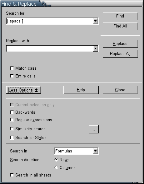 Calc, the spreadsheet program, contains additional location specifiers. Entire cells is Calc's equivalent of Whole words only. It sets the search for cells that match what is entered in the Search for field rather than strings of characters. Calc searches also can be limited by Search in, which confines the search to formulas, values or notes. And, in addition to Backwards, Calc also includes Search direction, which sets whether the spreadsheet is scanned by rows or by columns. Usually, Calc searches are confined to the current sheet, but you can broaden a search by selecting Search in all sheets.