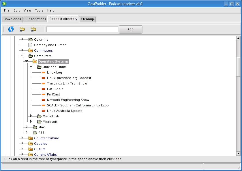 Now, let's get back to those podcast directories. Perhaps the most interesting here is the iPodder.org : Podcasting Central folder, because it contains the massive list of podcasts from iPodder.org. Click the small arrow next to the folder to list the categories, subcategories and, finally, all the various podcasts that correspond to that category. To subscribe to a podcast, click the title and then click the Add button. If the podcast you want isn't listed here, you can add it manually by clicking Tools on the menu bar and selecting Add a Feed. As you subscribe to various podcasts, subdirectories with the names of those podcasts will be created in ~/iPodderdata/downloads. For instance, I have folders called Coverville, New Scientist Podcast and Quirks and Quarks from CBC Radio among others. Each folder holds that particular show's podcasts, so make sure you have a lot of disk space.