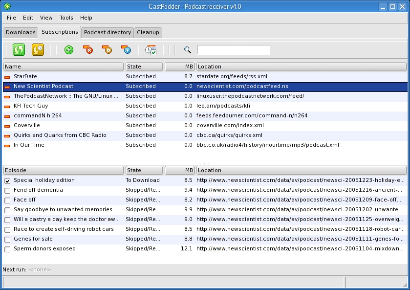 When you start CastPodder for the first time (command name: CastPodder), it creates a folder and subfolder called iPodderData/downloads in your home directory. You can override this default by selecting Preferences from the File menu. The CastPodder interface itself has the usual menu bar running along the top offering access to all the program's features. There are four main tabs labeled Downloads, Subscriptions, Podcast Directory and Cleanup. If it isn't already selected when you start, click the Podcast Directory tab, and you'll see a list of folders describing various directories and top podcast collections available. Before you go hunting for interesting shows, click the Refresh icon on the far left of the icon bar. That's the best way to make sure you are working from a recent list.