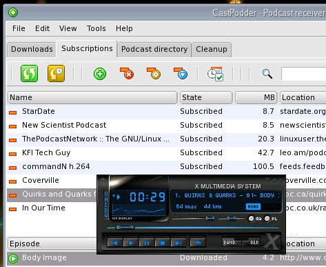 When the download is done, you'll find m3u playlist files in each of the podcast directories corresponding to your feeds (for example, ~/Podcasts/catalog/showname/showname.m3u). Sure, it's all command line, but once again, this is a great program to run in a cron job, quietly in the background, perhaps while you sleep. From time to time, it is also a good idea to run the program with the --stats option to see how many programs you have and how much space they are taking up.