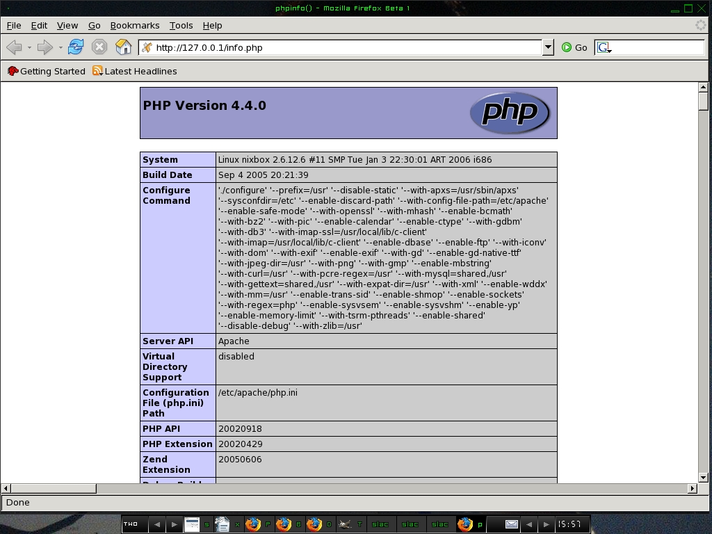 If you have Apache running on your own server, point your browser to http://127.0.0.1/info.php. If you are using a commercial host, point your browser to http://yourdomain/info.php. If everything is working, your browser should show something like what you see in Figure 1.