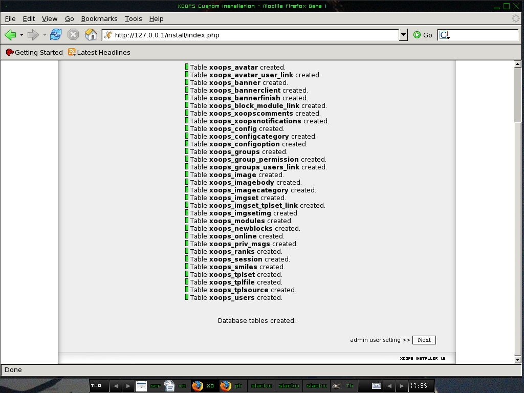 Click the Next button once again. Now the XOOPS installer creates all of the MySQL tables it needs (Figure 12).