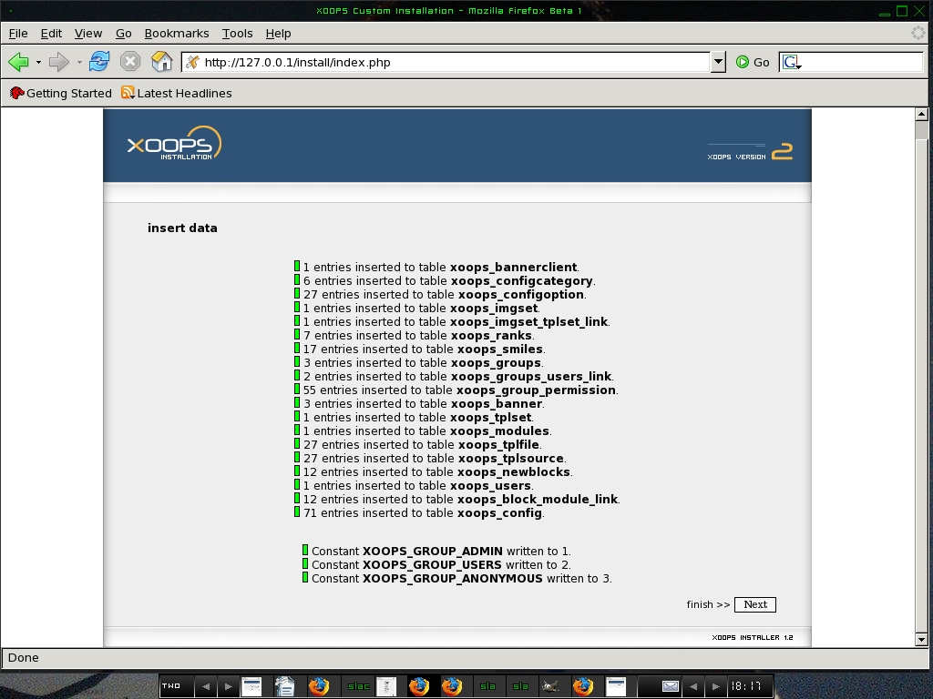 Click Next, and XOOPS uses this information to insert some starting data in various XOOPS tables (Figure 14).