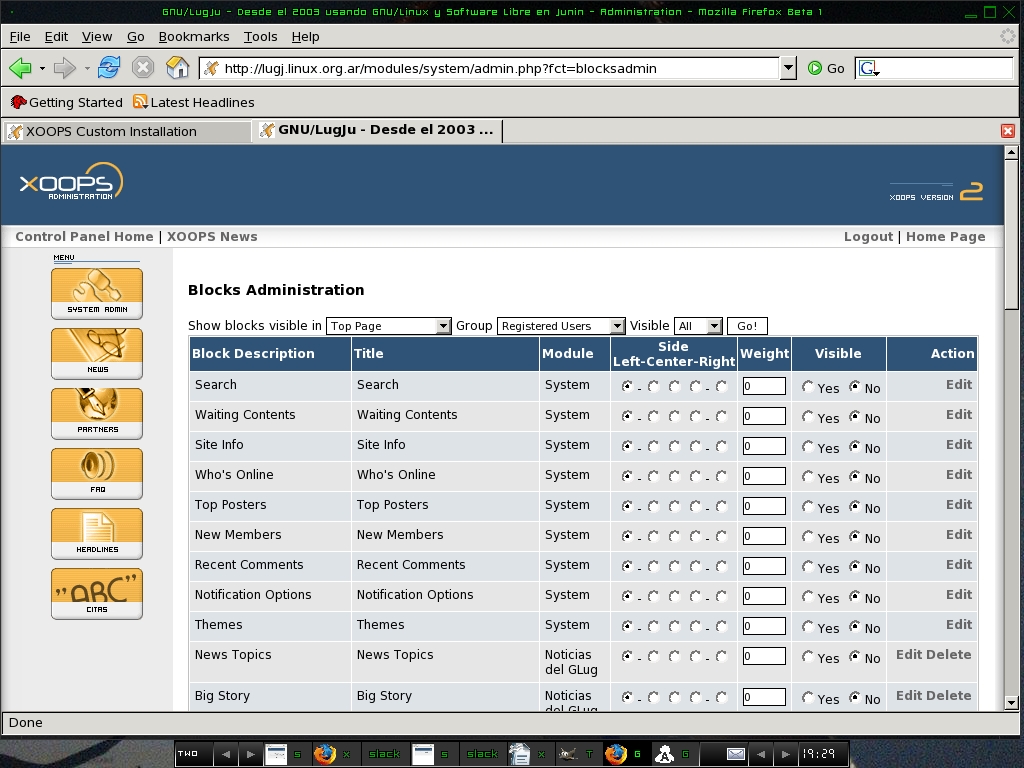 Once you have the modules installed and running, you can make the features they provide show up on your XOOPS home page. Go to the Blocks Administration section. You can add, modify or activate whatever modules you want and the features visible in various locations (the left column, middle, right column and so on). You can specify who will be able to see or use the various features. In most cases, you will want to let everyone view the blocks you choose to display. See Figure 18 for a sample blocks configuration screen.