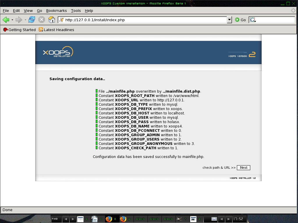 When you press Next after the confirmation screen, you should see a new screen with the title Saving configuration data (Figure 8). Press the Next button again. XOOPS will check to see if the physical and virtual path to the XOOPS files are correct (Figure 9).