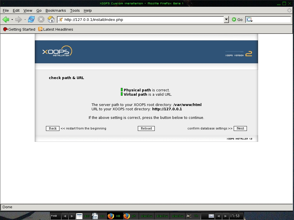 Now, back to the XOOPS Web configuration page. Fill in the correct information. Figure 6 shows the information for our sample installation. Normally, you would fill in the last field with the domain name for your Web server instead of using 127.0.0.1.