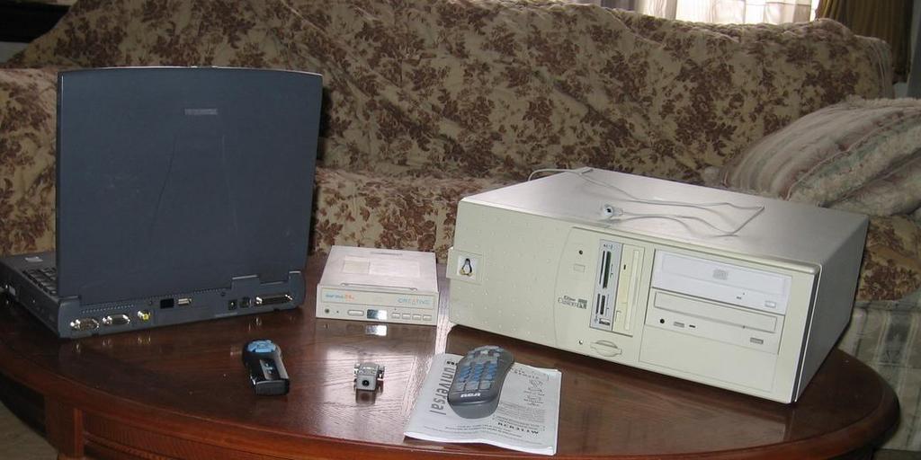 Here, I am going to demonstrate how to build a LIRC system. For hardware, you need an infrared receiver, which you might have already, and a remote control. A small number of PCs come with an infrared receiver that is supported by the LIRC software. Many laptops come with an IrDA standard interface for doing infrared networking and some IrDA interfaces, but not all of them work with LIRC. Many TV tuner cards come with an infrared port that is supported by LIRC. In addition, Creative Labs used to produce a series of CD-ROM drives that included an infrared port supported by LIRC. If you don't already have an infrared port for your PC, however, you need to look at other options, which I will get to shortly.