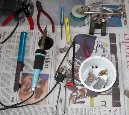 Do collect in advance the parts and tools you need for the project, as you see in Figure 2. Because I was doing my work at the kitchen table, I laid out some newspapers to protect the table surface.