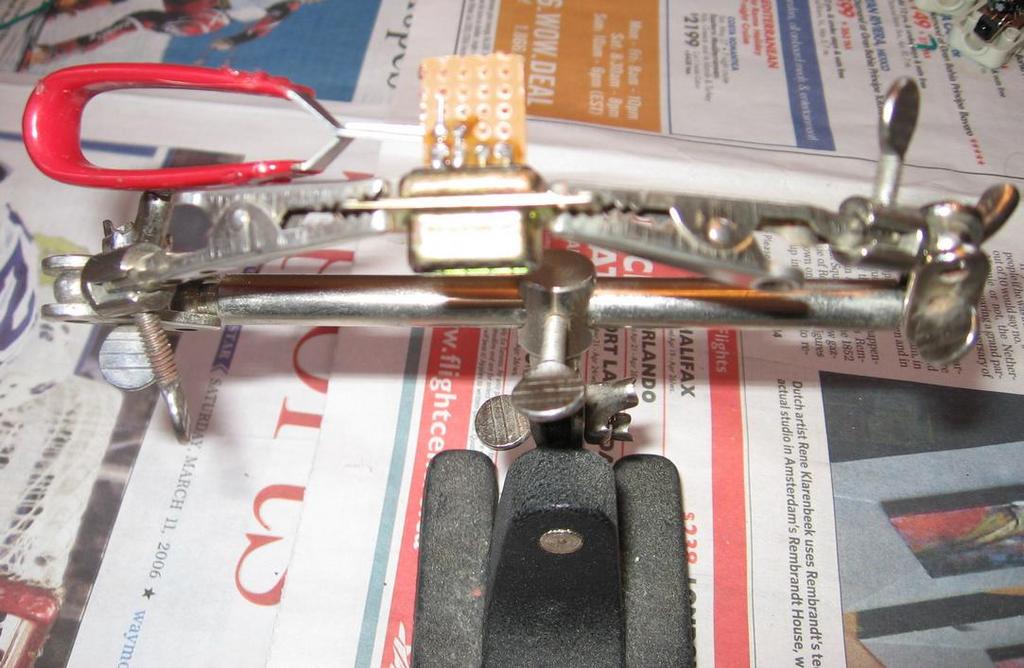 Heat is an issue throughout this project. As noted, the parts in this project can be destroyed by too much heat, yet we need enough heat to melt solder. People with a lot of experience soldering could bond all of these parts together quickly enough that heat doesn't build up, so they could get away without using a heat sink. But as a hobbyist who solders only occasionally, I find that a clip-on heat sink buys a lot of leeway and saves a lot of parts from destruction.