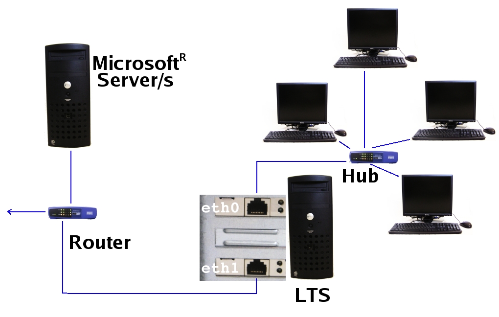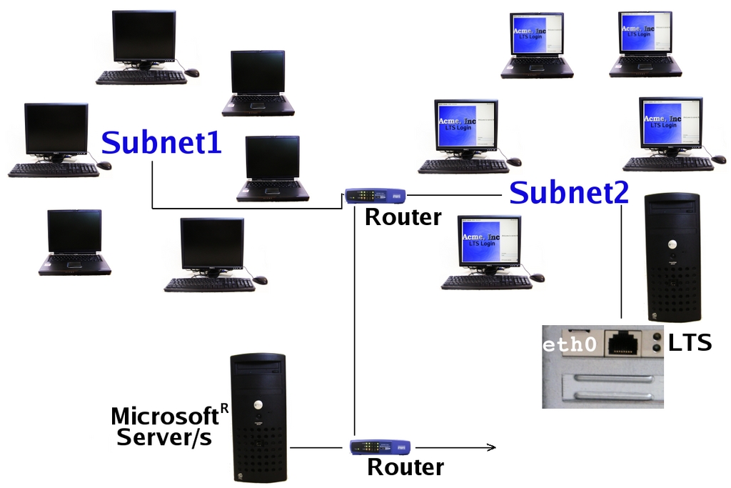 If you look at most of the existing installations of LTS, you'll find that they implement a closed subnet configuration. In such a configuration, the LTS serves thin clients within its own controlled subnet and provides routing to the overall organization's network through a second Ethernet port.