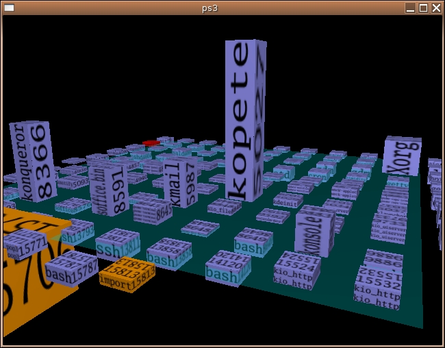 ps3 is in no way a scientifically accurate means of viewing system processes, but it is enlightening and entertaining. So now we have virtual buildings and the makings of a virtual city somewhere inside your system. All we're missing now are tanks. Well, I may have an answer to that one as well. It's called BZFlag, and this certainly calls for François to refill our glasses. Mon ami, if you please.