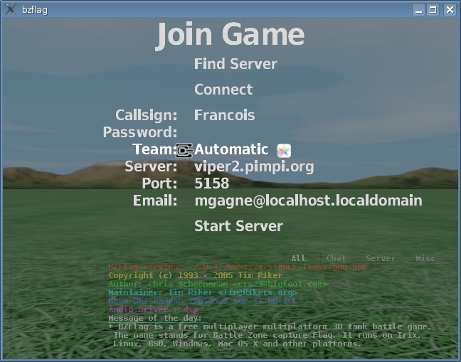 Unless you specify otherwise, BZFlag starts in full-screen mode, but you can override this by starting the program with the -window option. The game begins at the Join Game screen. Before finding a server (the first option on the screen), you may want to change your Callsign (or nickname). We'll look at some of these other options after we've selected a server. For now, move your cursor to the Find Server label and press Enter.