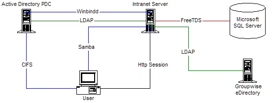 Our intranet currently serves about 70 employees and runs on an IBM x335 server running Fedora Core 4. We use a normal LAMP stack (Linux, Apache 1.3x, MySQL and Perl) with mod_perl to improve performance. Apache currently shares the server with our e-mail scanner, internal DNS, Jabber, Samba and some other services. It's nice having all of this running on a single Linux server, because it reduces the need for NFS mounts and cuts down on network traffic. Some sites will be too large for this approach, but nothing in our design would preclude it from working in a multiserver setup. All of our users run Windows XP and authenticate through Active Directory. We use GroupWise as our e-mail software running on a NetWare 6 server, and all of its information is handled by Novell's eDirectory. We also have a time and billing system that runs on a Windows NT 4.0 server and stores its data in a Microsoft SQL Server database. You can see a layout of how everything links together in Figure 1.