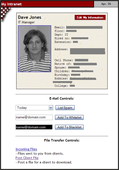 You can see here that we check to see if the person viewing the home page is actually a credentialed user. If he or she is not, we serve up a random employee's picture and profile in this section of the home page. If the person is a credentialed user, we grab the appropriate personal information from the LDAP directory and proceed to assemble a My Intranet area in this section of the home page where the user can edit his or her employee profile, control mail preferences and so forth. The get_emp_card($cn) routine simply looks up the user's current info in Active Directory and returns a nicely formatted HTML section to display it (Figure 2).