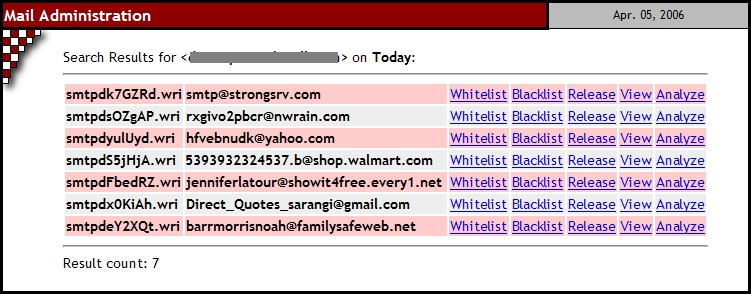 If these checks are successful, the script responds by showing users the requested day's spam in a table format with a list of option links on the side of each item (Figure 3). Users then can use the option links to have the script release the spam, whitelist its sender, blacklist its sender, produce a SpamAssasin report or simply display it as plain text. The script looks up the user's SSC information each time it's called and before any action is performed so that it knows whether or not to allow that action. I won't get into more detail here, because the functions of this script consist mostly of just moving files around in response to users' requests. I do want to mention the whitelist and blacklist options though.