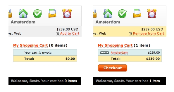 Let's look at an example to see how this can be used. The on-line store IconBuffet uses RJS for its shopping cart (see www.iconbuffet.com/products/amsterdam to try it out). When a product is added to the cart, three separate page elements need to be updated to reflect the change. Before RJS, that would entail a dozen lines of JavaScript and multiple round-trips to the server. But now, it can be accomplished in one pass, with no custom JavaScript.