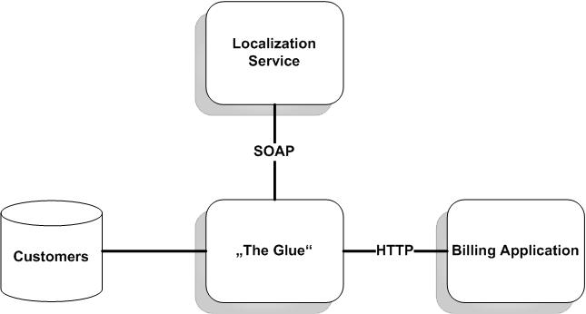 To fulfill this requirement, the team developing the billing application needs a new HTTP service. The service gets a customer ID and should return the coordinates belonging to the customer's address in XML format. Our company already has a customer database, and it has access to a SOAP localization service. The target system architecture looks like Figure 1, and it's our task to build the new HTTP service.