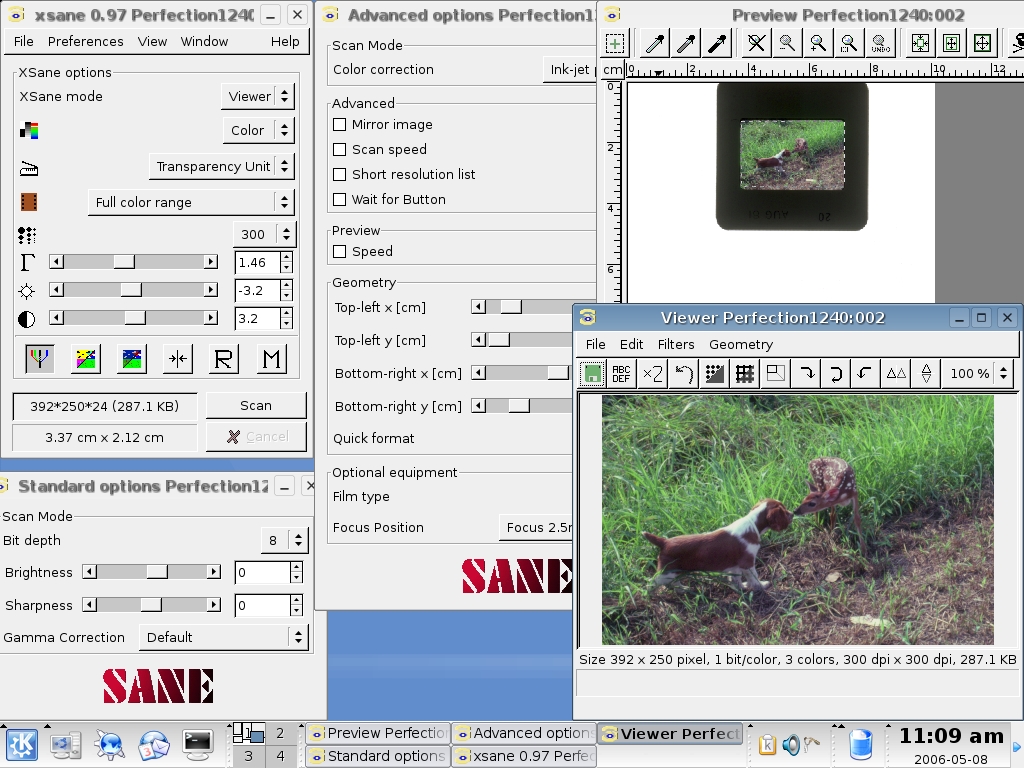 XSane can be run either in KDE or GNOME. To open XSane, again go to the Graphics menu item and select XSane. One immediate difference you will notice is that XSane opens a host of windows (Figure 2). I generally have the Standard Options, Advanced Options and Preview windows open in addition to the Program window. This can be controlled by clicking on the Window menu item in the Program window and selecting or deselecting the appropriate items.