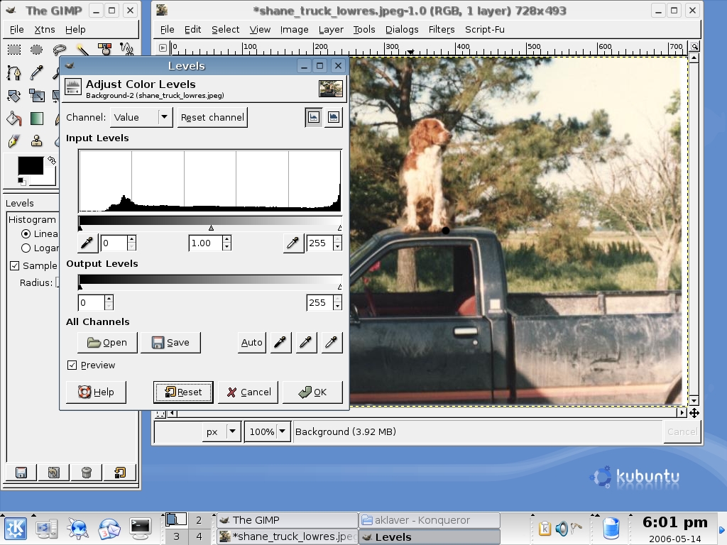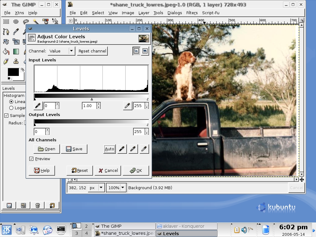 Space does not permit a full exploration of the features in The GIMP, so I point out those I have found particularly useful. First, in an open image window, select Tools→Color Tools→Levels. A new window opens (Figure 7). Look for the Auto button, click on it and the image color levels are adjusted automatically (Figure 8). Often this is all you need to do to improve a picture. If the Auto correction does not work, next to the Auto button is a row of eye dropper icons representing the black point, grey point and white points of the image. Use one of the eye droppers to select a “known” color point in the picture, and the picture adjusts accordingly. You can undo your changes by clicking on Reset, so experiment away.