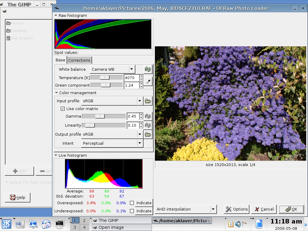 The real flexibility comes through the plugin architecture of The GIMP. The program comes with a series of default plugins, and you can extend these by downloading others (see Resources). Plugins can show up in many areas, so the best way to identify what is available is to use the plugin browser located in the Xtns menu item of the program window. One optional plugin I have found particularly useful is UFRAW (see Resources). It allows you to get around the 8-bit limitation current versions of The GIMP have on RAW files. Basically, it loads a RAW file into its own viewer at its native bitrate and allows you to adjust the image (Figure 9). After the image has been changed in the plugin, clicking OK mixes it down to the 8-bit format of The GIMP and opens a window for further work in The GIMP.