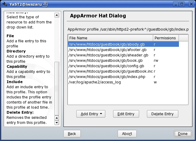 The most common use of hats is for Web applications that are run without actually being part of httpd dæmons. Figure 4 shows the contents of just such a hat, corresponding to a guestbook application on my Web server. The index.php script referenced in Figure 4 mainly needs read access to some files, but it also needs to both read and write to the guestbook file itself (book.gb) and also Apache's access log (access_log).