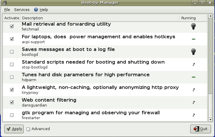 For test purposes, I created a new user account on Ubuntu Dapper Drake (Figure 3). Using the checklist features, I severely limited the capability of the user test. Although these privileges could be just right for anyone who has no computer experience or who is plainly not trustworthy. Utilities like update-rc.d and fcconf define certain programs to start at the system boot. I used a bootup manager called BUM to make DansGuardian and Tinyproxy start at each boot.