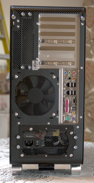 On the back panel (Figure 5), you can see at the top the connectors for both video cards. Below and on the right are the 5.1 analog audio connectors, the two Gigabit Ethernet jacks, four USB ports, a FireWire port, a parallel port, PS/2 mouse and keyboard jacks, and both coaxial and optical S/PDIF jacks for digital audio and features, such as 5.1 surround sound.