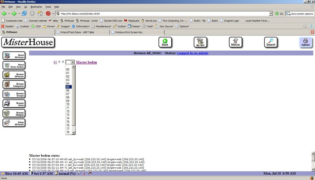 This would create an HVAC_Zone object named master_bedrm in groups All_HVAC and Thermostats, with a setpoint of 72 and a delta of +/– 2°. A few minor alterations to the MisterHouse Web server were necessary to create a Web control that is displayed for each zone. I used the X10 Lamp item as a reference, as it already had a drop-down as well as arrow buttons for relative changes.