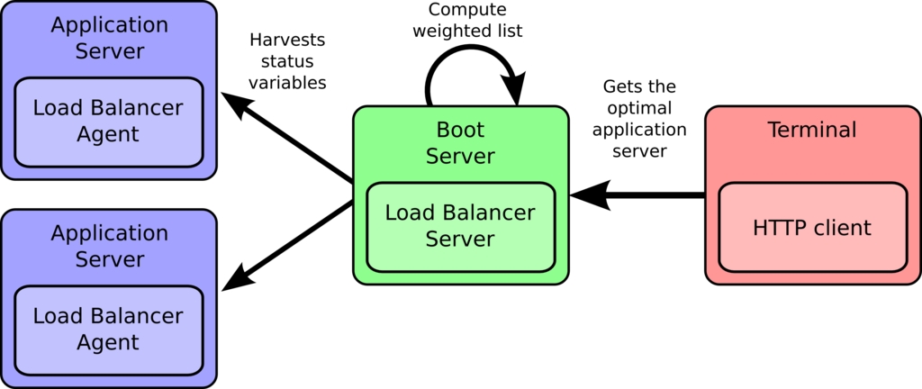 When a terminal boots, it requests a display from the application server. To dispatch users on available application servers, MILLE-XTERM provides a load balancer. The first version of the load balancer (proof of concept) required five lines of PHP and returned a random address from a static list of application servers. Although simple, this approach had some drawbacks. First, an off-line server should be removed from the list and not be returned to the terminals. And, to provide reliable load balancing, several factors, such as number of processors, speed and load average have to be taken into account. Therefore, a much more robust and complete Python system has replaced the initial prototype (Figure 4). The load balancer agent runs on every application server, collecting data on the state of the application server and waiting for load-balancer server requests. The balancer is also a Python script that runs on the boot server. It contacts each load-balancer agent to determine its state and computes a weight for each server. A greater weight indicates that the server is less loaded and will be selected more often statistically to accept new users. A terminal request for an application server will then prompt the load-balancer server to get a randomly chosen application server in the weighted list.