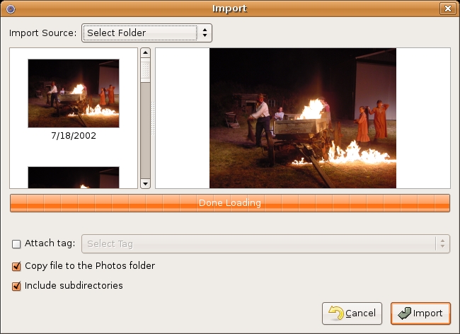 Importing from a digital camera is likewise a very easy process. Simply connect the camera to your computer, and choose the camera from the Import Source drop-down menu. F-Spot recognizes most digital cameras automatically.