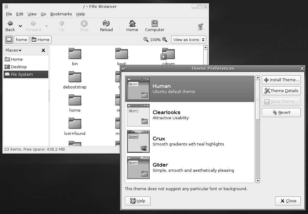 Ubuntu refers to the look of the desktop as a theme. Because it's built on the GNOME desktop, Ubuntu allows you to radically personalize your desktop theme. Several different themes come with the distribution, and you can download many more themes. Each lets you change the way the windows look, including the buttons and the icon set (although some themes come without additional icons).