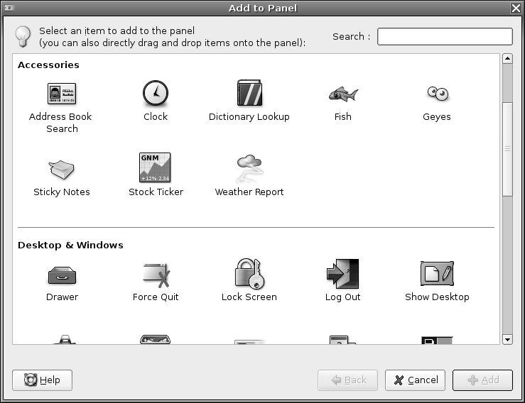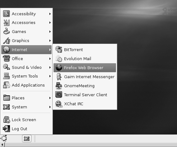 You can add either the Applications menu or the entire set of menus (Applications, Places, and System) to the bottom of the screen. This can help those who long for the Windows Start button approach to access programs.