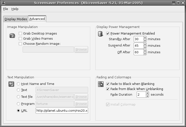 To configure this aspect of Ubuntu, select System→Preferences→Screensaver, and click the Advanced tab, as shown in Figure 11. In the Display Power Management section, make sure the Power Management box is checked. Set the desired timings in the Standby, Suspend, and Off boxes. Not all monitors support all three features. Consult your monitor's manual to determine which you should configure. If you're unable to find this information, simply set all three to similar values. For example, set Standby to 30 minutes, Suspend to 31, and Off to 32.