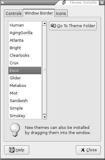 Installing new theme components is easy. If you wish to install a new window border, for example, click the link to browse the examples and then, when you find one you like, click to download it. It will be contained in a .tar.gz archive, but you don't need to unpack it. Simply select System→Preferences→Theme and click the Install Theme button in the Theme Preferences dialog box. Then browse to the downloaded theme and click Open. You can delete the downloaded file when you're finished.
