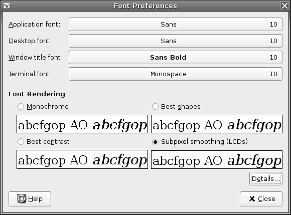 By clicking the entries under the Font Rendering heading in the Font Preferences dialog box, you can change how fonts look on your monitor. This will alter the antialiasing and hinting of the font. Antialiasing softens the edges of each letter to make them appear less jagged. Hinting affects the spacing and shaping of the letters. Used together, they can make the on-screen text look more pleasant. Try each Font Rendering setting in sequence to see which looks best to you (the text in the dialog box will update automatically to show the changes). Nearly everyone with a TFT-based screen, including notebook users, finds the Subpixel Smoothing option best.