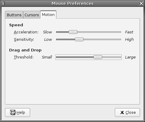 Motion: This tab, shown in Figure 5, lets you alter the speed of the mouse pointer, as well as the drag-and-drop threshold. Changes are made as each setting is adjusted, so to test the new settings, simply move your mouse. Here's what the settings do: