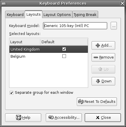 Layouts: On the Layouts tab, you can choose to add an alternative keyboard layout, as shown in Figure 6. For example, if you write in two different languages on your keyboard, it may be helpful to be able to switch between them. Click the Add button and select the second language from the list.