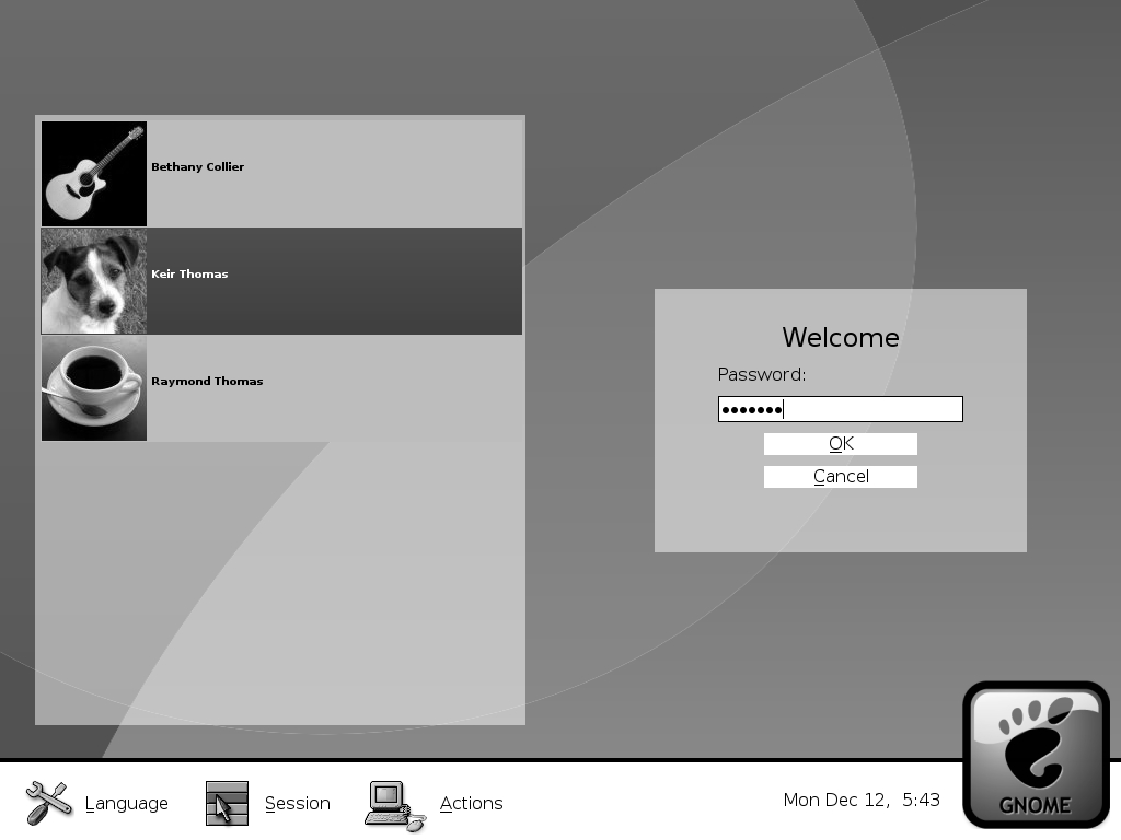 If you activate the Face Browser feature along with the Happy GNOME with Browser option, GDM will display a picture alongside your username on the login screen, as shown in Figure 7. You can then click this and type your password to log in. You might be familiar with a similar system under Windows XP.
