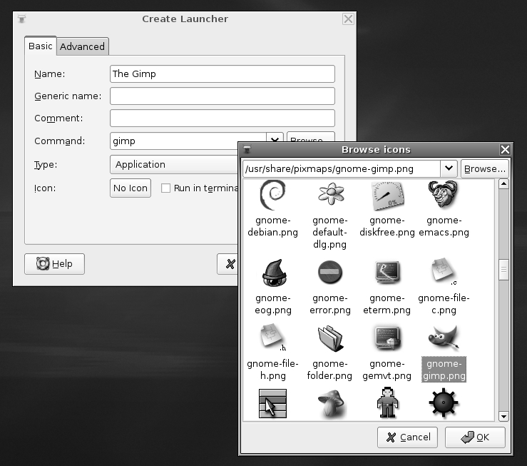 To choose an icon for your launcher, click the Icon button in the Create Launcher dialog box. If you don't choose an icon, the stock GNOME one is used (the same icon as is used for unidentified and/or system files). You can select from several predefined icons or choose your own picture by clicking the Browse button, as shown in Figure 8.