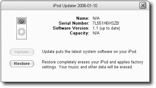 When the machine starts up again, the iPod Updater will automatically detect that you have an iPod in a non-Microsoft format connected to the machine and ask you if want to update it. You do, so click Yes, after which the iPod Updater will appear (Figure 16-2).