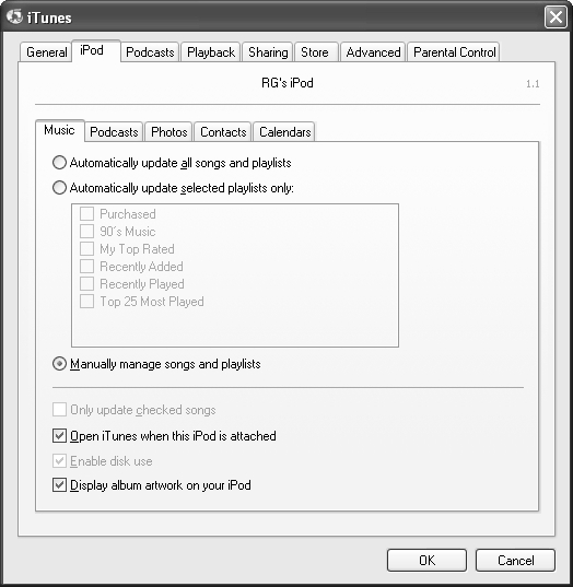 If you have an iPod that is already in FAT32 format, it is best for you to disable the auto-update function on your iPod while it is connected to your Winbox, before bringing your iPod into the Linux world. To do this in Windows, just go to the iTunes Preferences (while your iPod is connected), click the iPod tab, and then select Manually manage songs and playlists (Figure 16-3).